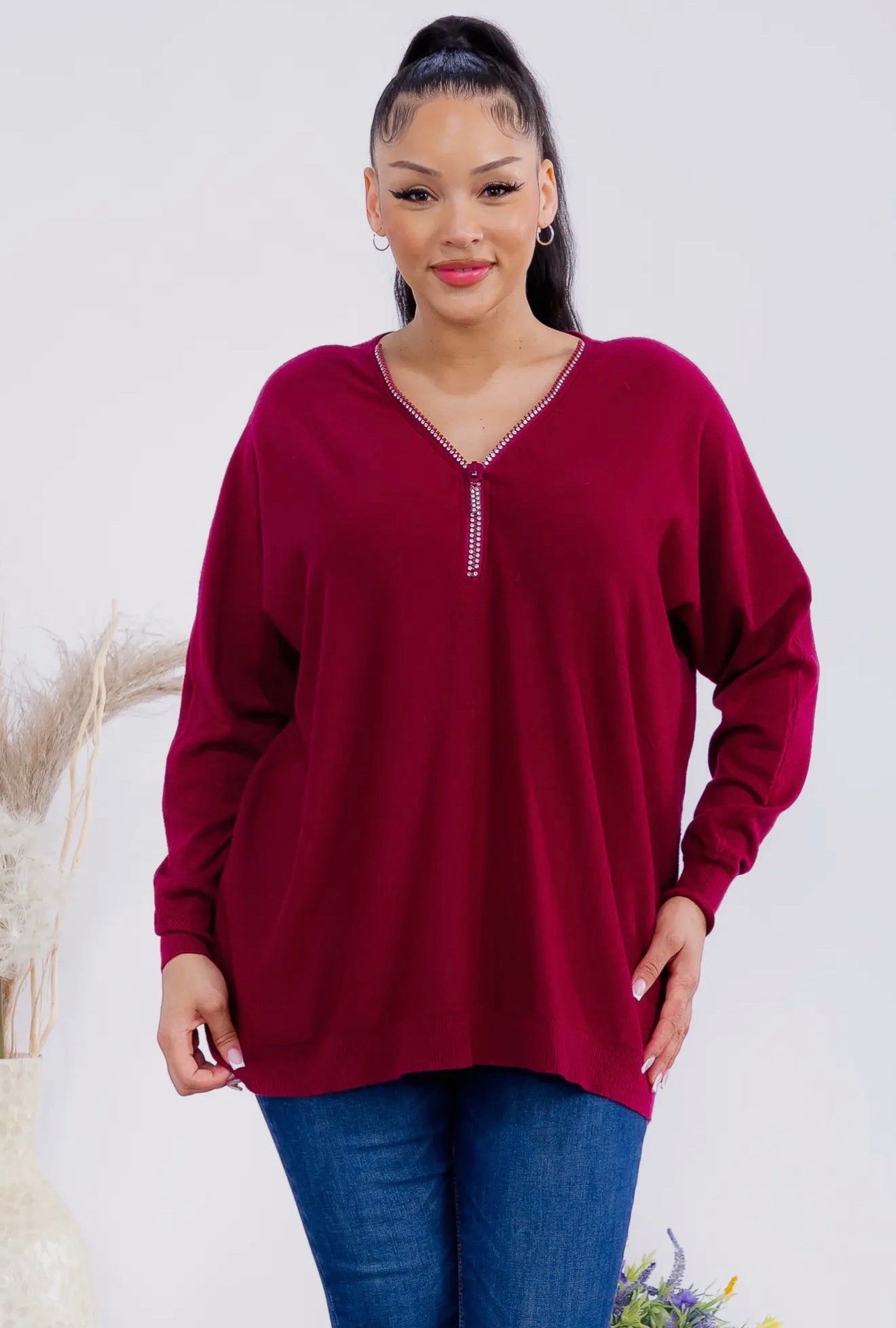 A soft knit sweater featuring a stylish zip-front V-neckline outlined with delicate rhinestones for a touch of sparkle.